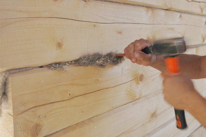 Das hölzerne Blockhaus schrumpft allmählich, wodurch sich Risse in den Wänden bilden können. Unmittelbar vor der Isolierung von innen müssen alte Mauern ausgegraben werden. Jute wird normalerweise zum Abdichten verwendet. Wenn die Lücken groß genug sind, ist es besser, Klebeband zu verwenden. Das Abdichten erfolgt durch Hämmern des Materials mit einem Meißel in den Spalt zwischen den Stämmen oder Balken. Somit wird der Schutz des Blockhauses vor Blasen gewährleistet und eine zusätzliche Wärmedämmung geschaffen. Es ist notwendig, das Material in die Schlitze zu hämmern, bis die Schlitze vollständig damit gefüllt sind, bis es nach außen ragt. Die Qualität der Dämmung der Wände eines Holzhauses von innen hängt auch von einer hochwertigen Abdichtung ab.