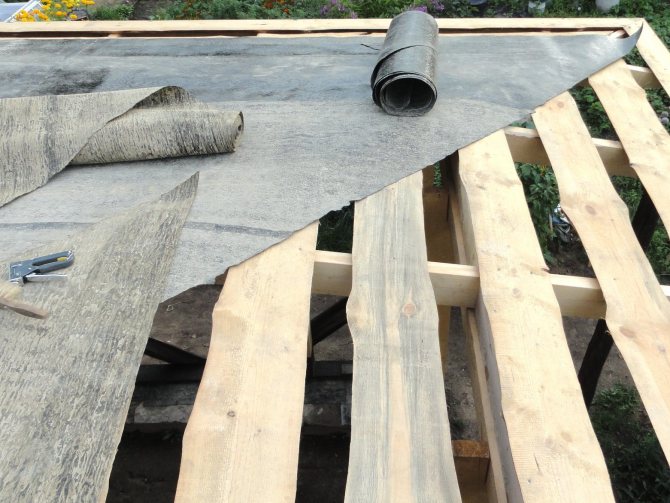 Die bituminöse Leinwand muss unbedingt unter die Kiste gelegt werden. Nach Abschluss der Verlegearbeiten wird eine Metallabdeckung auf der Holzkonstruktion angeordnet. Nur so erhalten Sie einen relativ hochwertigen Dachkuchen, der 10 Jahre lang nicht repariert werden kann.
