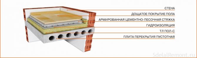 Es entstehen Holzstämme, auf die anschließend Sperrholz gelegt wird. Der resultierende Raum unter dem Sperrholz kann mit absolut jedem Material zur Wärmedämmung gefüllt werden. Diese Option zur Schaffung einer warmen Basis erleichtert die zukünftige Verwendung von Bodenbelägen. Es gibt keine Einschränkungen.