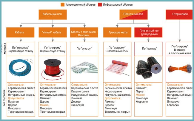 Da elektrische Fußbodenheizungen bei Verbrauchern am beliebtesten sind, bieten produzierende Unternehmen verschiedene Varianten davon an: