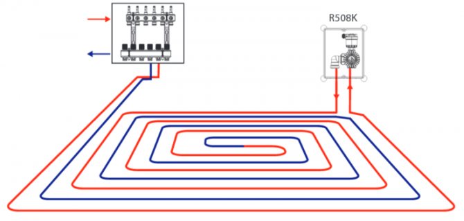Die Pumpe fördert auf 70 ° C und höher erwärmte Flüssigkeit in das Rohrsystem, Wärme wird an die Basis des warmen Bodens übertragen, wodurch nach dem Durchlaufen des Rohrkreislaufs das Wärmerelais ausgelöst und die Pumpe ausgeschaltet wird. Das Abkühlen der Flüssigkeit erfolgt auch im Verteiler. Bei Erreichen einer niedrigeren Temperatur als der eingestellten erfolgt der umgekehrte Vorgang: Die Pumpe schaltet sich ein und das Kühlmittel wird erwärmt.