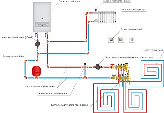 - Parallelschaltung des Verteilers an die Heizungsanlage. Die Stromkreise werden in die Leitung zu den Batterien geschnitten. Die Zirkulation der Flüssigkeit erfolgt durch eine Pumpe.