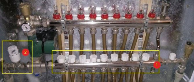 Die manuelle Einstellung erfolgt mit Thermoköpfen, die an den Rücklauf- und Versorgungsverteilern installiert sind. Es braucht Erfahrung und Zeit. Das Ergebnis erscheint in 3-4 Stunden. Es wurde experimentell festgestellt, dass der Raum 20 bis 25 ° C beträgt, wenn die Temperatur am Eingang des Systems 40 bis 55 ° C erreicht.