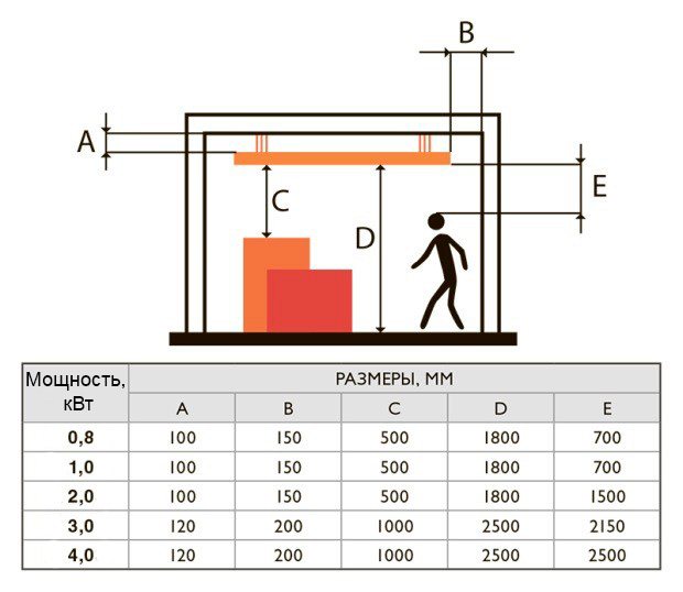 - Standort der Heizungen - Um den Schaden von Infrarotstrahlern zu neutralisieren, ist es ratsam, diese so anzuordnen, dass sie die umgebenden Objekte erwärmen. Sie müssen auch einen Abstand von Heizungen zu Personen einhalten.