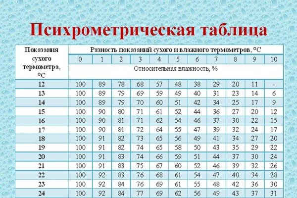 - Ermitteln Sie den resultierenden Unterschied anhand der Werte einer speziellen psychometrischen Assman-Tabelle, um die Luftfeuchtigkeit in dem von Ihnen benötigten Raum zu bestimmen.