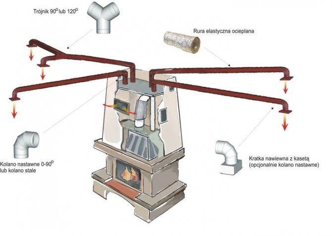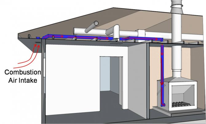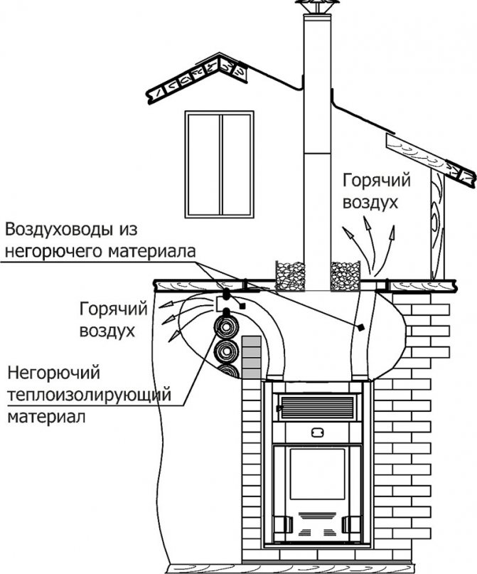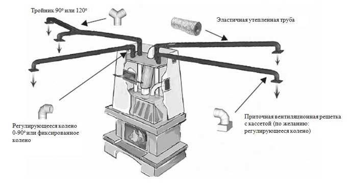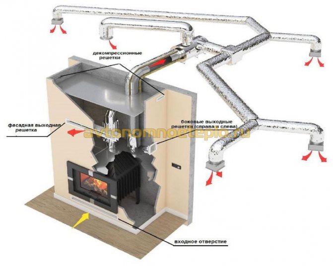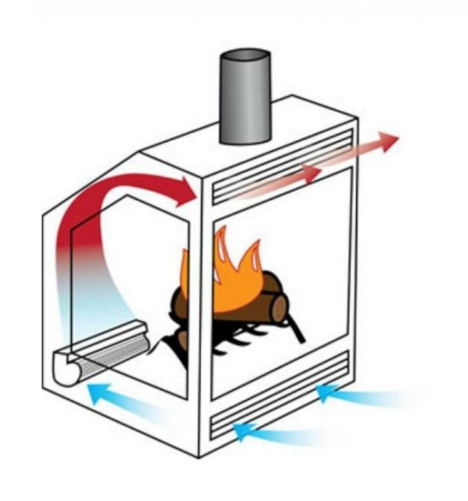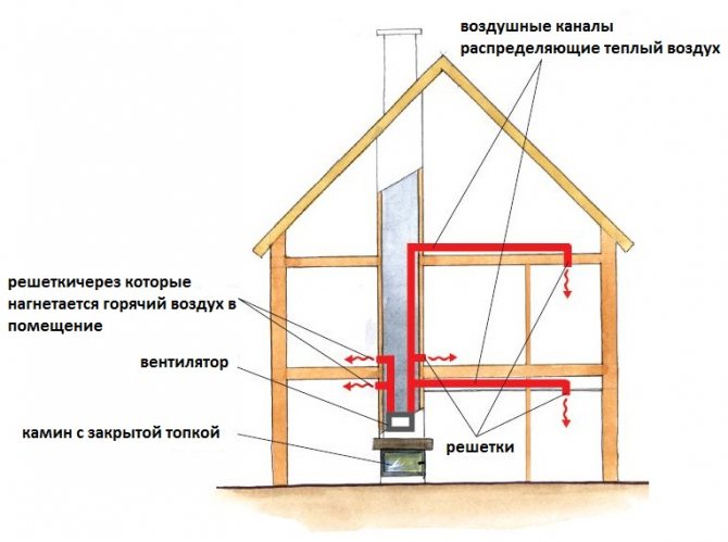 Wenn Energie von einem Medium auf ein anderes übertragen wird, wird die Menge der übertragenen Wärme erheblich reduziert. Ein richtig gestalteter luftbeheizter Kamin kann dieses Problem aufgrund der geringen Anzahl von thermischen Übergängen lösen. Die Vorrichtung besteht darin, Brennstoff in einer separaten Kammer zu verbrennen, den Metallteil des Ofens und die Luft im Raum zu erwärmen. In diesem Fall erfolgt die Energieübertragung über flexible wärmeisolierte Kanäle, die mit anderen Teilen des Wohngebäudes verbunden sind.