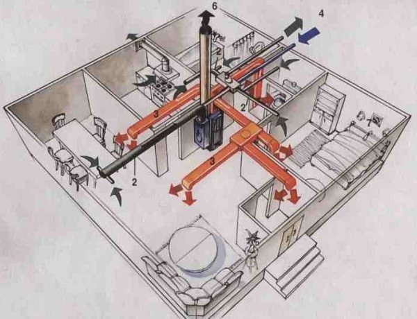 Die Kaminluftheizung eines Hauses mit einer großen Anzahl von Räumen und einer Rohrlänge von mehr als 3 Metern sollte nach einem Schema mit Zwangsumwälzung durchgeführt werden.