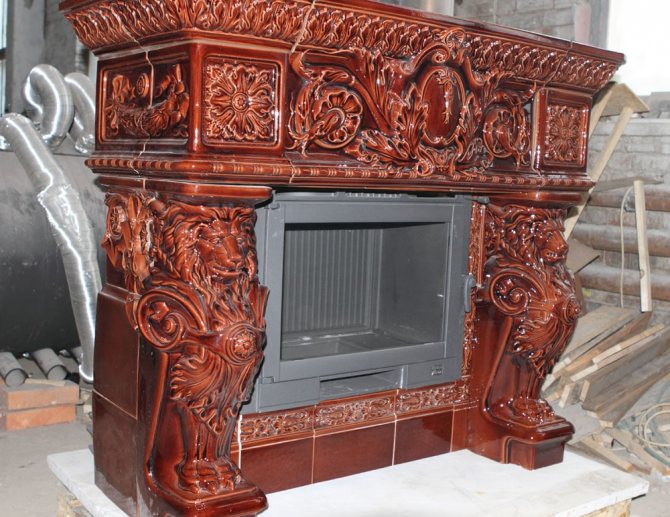 Der Kaminofen kann für nahezu jede Konfiguration individuell gestaltet werden. Fliesen betonen die Individualität des Innenraums. In solchen Kaminen werden in der Regel hochwertige Arbeitssteine (feuerfest) verwendet.