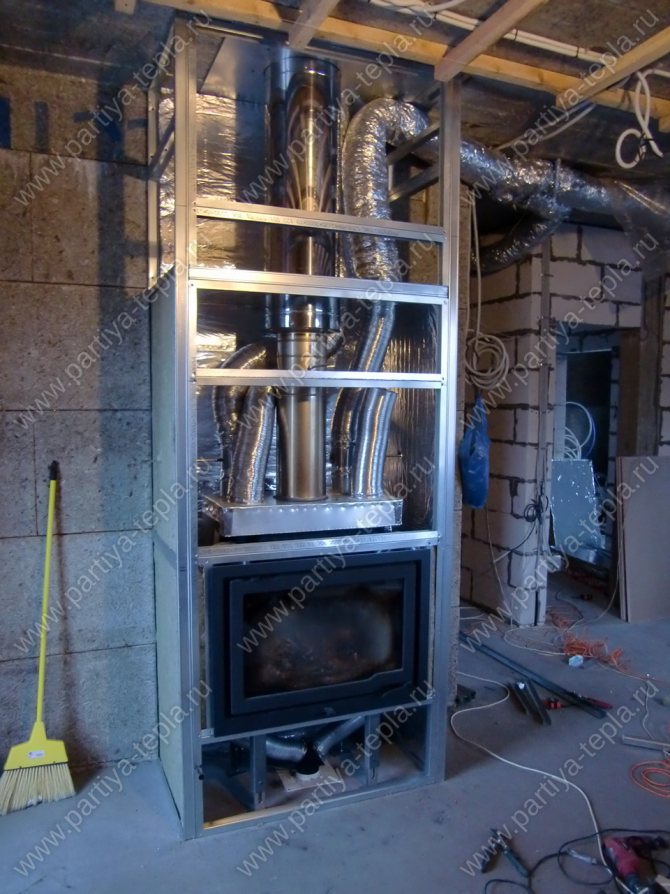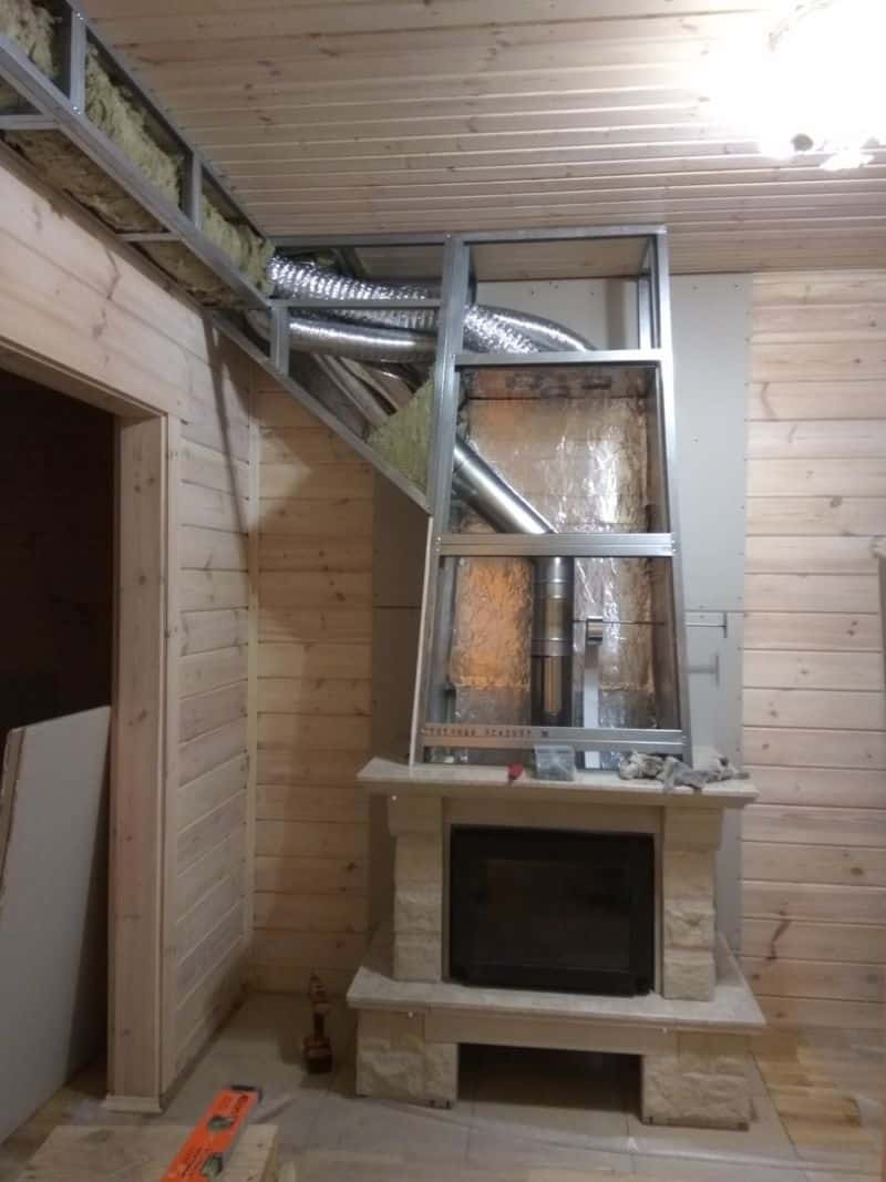 Die gleiche Linie besteht aus Ziegeln beim Bau eines Hauses oder aus einem flexiblen Metallrohr. Die Aufgabe des Kapitäns besteht darin, diese Leitung so zu wärmeisolieren, dass die Luft während des Transports so lange wie möglich Energie behält.Sie können den Kanal mit einem Trockenbaukasten verstecken. Zu diesem Zweck wird ein Rahmen aus einem Metallprofil hergestellt und mit hitzebeständigen Gipskartonplatten ummantelt. In einigen Fällen werden Luftkanäle innerhalb der Wand hergestellt.