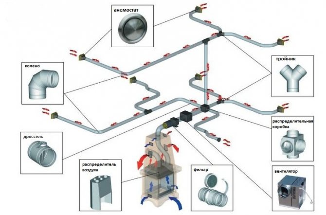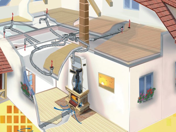 Die Verteilung der erwärmten Luft in den Räumen des Hauses erfolgt über Rohrleitungen, die in den Wänden oder in den Decken installiert sind.