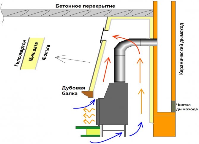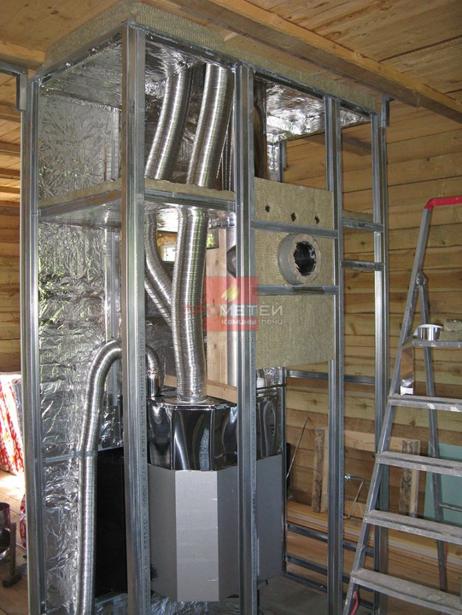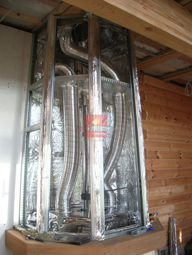 Als Schornstein kann ein verzinktes Rohr aus hitzebeständigem Stahl verwendet werden. Ein solcher Schornstein ist mehrschichtig (so entsteht eine Art "Sandwich"), an drei Seiten ist er mit Gipskartonplatten verschlossen.