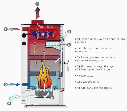 Die Struktur eines solchen Schemas sollte eine Pumpe umfassen, die Luft unter dem Ofenkörper oder über sich selbst fördert.