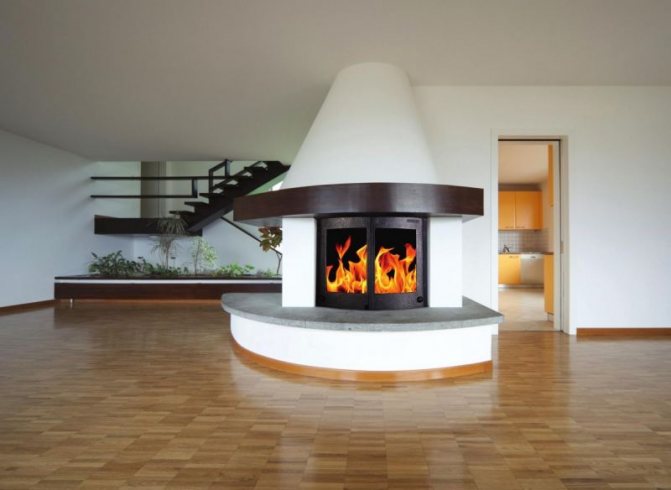 Der originellste, beliebteste und schönste Typ. In der Ecke gelegen, sieht es sehr attraktiv aus. Es wird ein wenig Platz im Raum brauchen. Das Erscheinungsbild wird noch besser, wenn die Öffnung des Kamins entlang der Achse des Winkels ausgerichtet ist, der von den Wänden des Raums gebildet wird.
