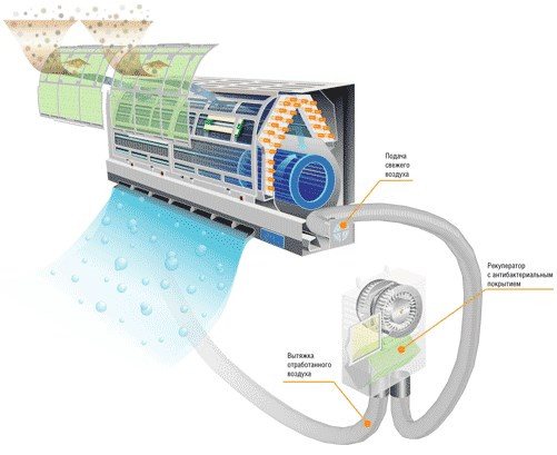 Eine Klimaanlage, die einen Raum mit Frischluft versorgen kann, unterscheidet sich von einer herkömmlichen Klimaanlage durch das Vorhandensein eines speziellen Luftkanals, dessen Design unterschiedlich sein kann.