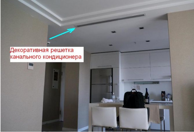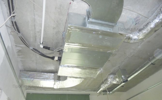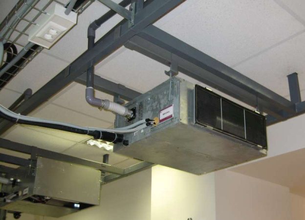 Das Innengerät enthält einen Mindestsatz an Komponenten: einen Verdampferwärmetauscher und einen Lüfter, einen Temperatursensor, einen Luftreinigungsfilter usw. In der Regel ist es in eine abgehängte Decke eingebaut, was aufgrund der Notwendigkeit erforderlich ist Zuluftkanäle zum Gerät.