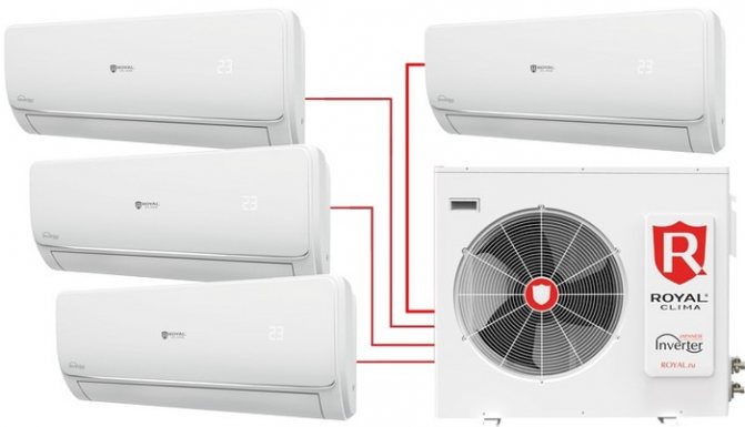 Die Apartments verfügen über Multi-Split-Systeme. Sie stellen eine Installation mit einer Einheit im Freien dar. Es können 2-4 Innenmodule vorhanden sein. Das System ist mit einem zusätzlichen Gerät zur Luftaufbereitung von der Straße ausgestattet. In solchen Klimaanlagen überschreitet die Frischluftzufuhr 10% des Gesamtvolumens im Kreislaufsystem nicht. Ein Spezialist kann ein Multisystem installieren und korrekt berechnen. An allen Austrittspunkten sind die Luftparameter gleich. Dies ist der Hauptnachteil eines Mehrpunkt-Split-Systems. Mehr als 4 Abtastpunkte sind nicht vorgesehen, da es schwierig ist, ein solches System hinsichtlich der Leistung auszugleichen.