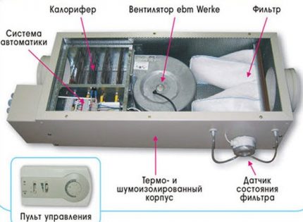 - Innengerät, das einen Lüfter, einen Wärmetauscher mit einem Lüfter, einen Filter und ein Steuermodul umfasst; Eine zusätzliche Heizung ist an das Gerät angeschlossen und befindet sich in einem separaten Gehäuse.