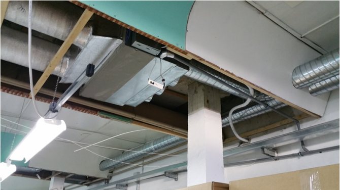 Bei der Installation der Verdampfer über Kopf ist es wichtig, dass der kühle Luftstrom nicht in den Bereich gelangt, in dem sich Personen befinden. Daher werden schmale Schlitzjalousien verwendet. Je höher die Decke, desto besser werden die Gegengasströme gemittelt. In einem geteilten Kanalsystem beträgt der Abstand zwischen der normalen und der Zwischendecke nicht weniger als 25 cm. Gleiches gilt für die Zwischenwände, hinter denen die Kanäle verlaufen.