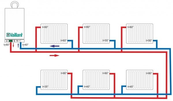 Das Heizungs-Zweirohrsystem besteht aus einer Verkabelung von 2 Rohren. Ein Rohr ist die Zufuhr eines heißen Wärmeträgers, das zweite Rohr ist eine Rücklaufleitung im Heizsystem, durch die bereits gekühltes Wasser von den Heizgeräten in den Kessel gelangt. Ein solches System ermöglicht es, alle Heizgeräte nahezu parallel zu schalten, wodurch es möglich ist, jedes Heizgerät separat flexibel einzustellen, ohne den Betrieb anderer zu beeinträchtigen.