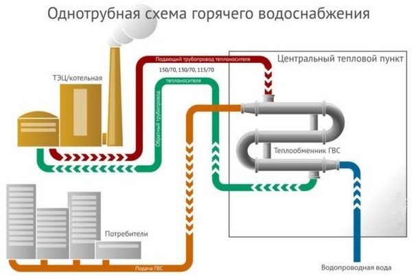 Es ist zu beachten, dass heute die Wege zur Warmwasserversorgung und zum Heizen separat zu Mehrfamilienhäusern angefahren werden können. Oder es wird ein Rohr mit einer bestimmten Temperatur (bis + 95 ° C) geliefert, das im Keller des Hauses in Heizung und Warmwasserversorgung unterteilt wird.