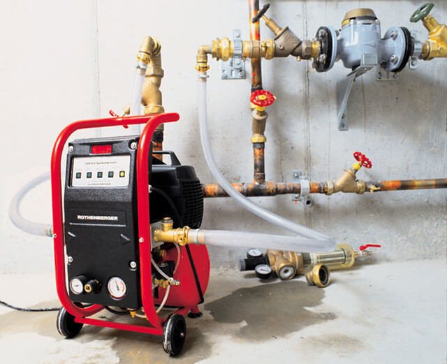 Zum Spülen wird der Kreislauf mit Wasser gefüllt. Ein Luftkompressor ist daran angeschlossen. Dies fördert eine schnelle Zirkulation des Kühlmittels und verursacht das Auftreten turbulenter Strömungen. Infolgedessen können sich verschiedene Ablagerungen leicht von den Wänden von Rohrleitungen und Batterien lösen.