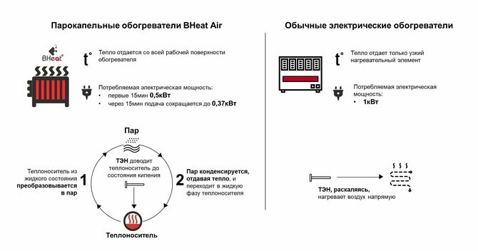 - Ein Gerät mit einem ähnlichen Gerät kann mit einem Minimum an Elektrizität betrieben werden, aber eine Dampf-Tropfenheizung verwendet es in viel größeren Mengen.