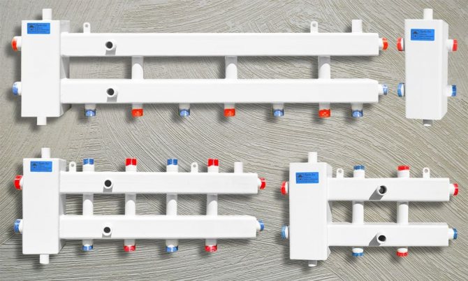 Die Kämme haben ein ähnliches Design - sie haben Standard-Drosselgewinde und Bohrungsdurchmesser. Der Anschluss kann mit verschiedenen Arten von Rohrleitungen und Formstücken erfolgen. Der Unterschied kann die zulässige Anzahl der Armaturen sein - sie variiert zwischen 2 und 12 Stück. Die Kämme können leicht zusammen gruppiert werden, um die erforderliche Anzahl von Biegungen bereitzustellen.