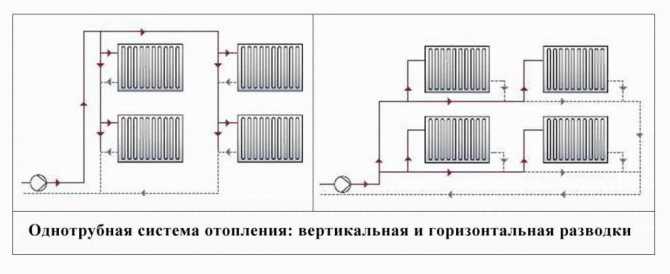 Einrohrheizsystem: Diagramm zum Anschluss von Heizkörpern und zur Bewegung des Kühlmittels durch die Rohrleitung