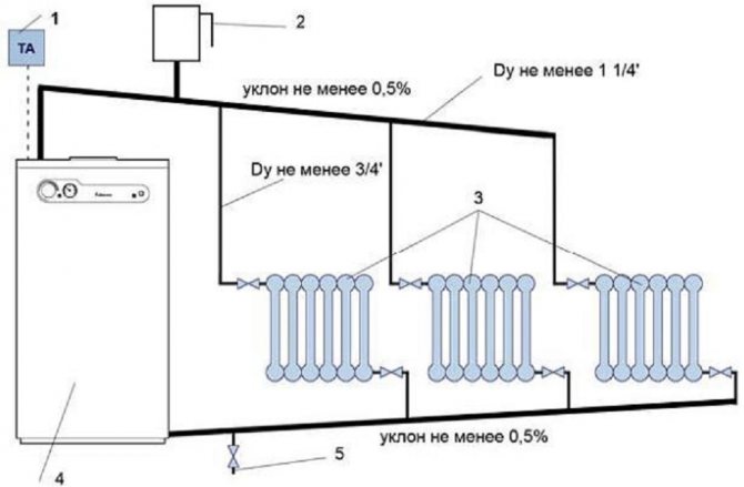 Das Zweirohrschema zum Anschluss eines Gaskessels in einem Privathaus ist hinsichtlich der Gleichmäßigkeit der Heizung selbst bei Verwendung eines "Schwerkraftsystems" am optimalsten, jedoch materialintensiver. Bei diesem Schema tritt das Kühlmittel durch die Zuleitung in die Batterien ein und kehrt durch eine andere zurück, die als "Rückleitung" bezeichnet wird. Alle Heizgeräte sind parallel an diese beiden Leitungen angeschlossen, was die Reparatur und Einstellung der Temperatur erleichtert verschiedene Räume.