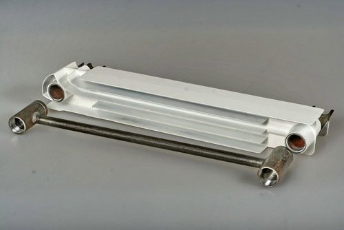 Ihre Struktur ist einfach. Im Inneren des Aluminium-Wärmetauschers, der die Luft im Raum effektiv erwärmt, befinden sich Stahlrohre, die das Kühlmittel zirkulieren lassen und das Nichteisenmetall vor den zerstörerischen Auswirkungen aggressiver, in Wasser gelöster Chemikalien schützen.