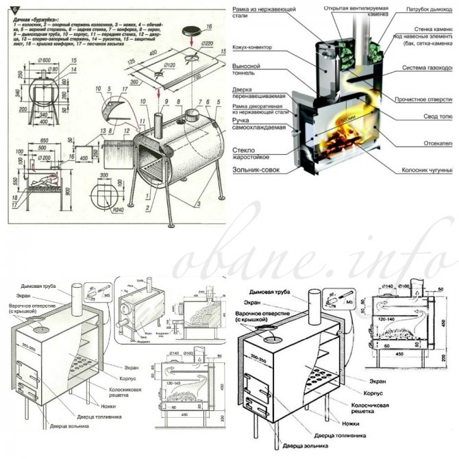 - Kompaktes Metallgehäuse mit einem toten Herd oder Roststangen und einem seitlichen Kamin.Die obere Ebene des Schranks kann als primitives Kochfeld verwendet werden.