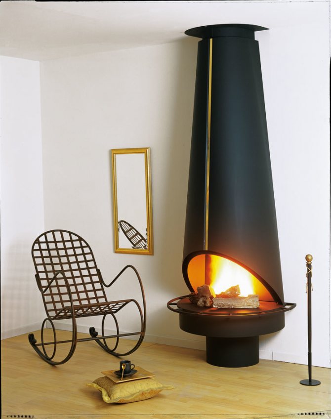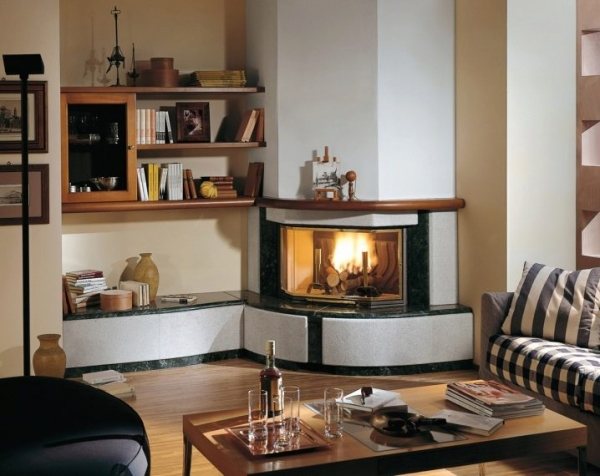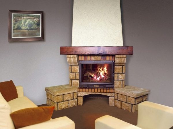 Das Eckmodell eignet sich für relativ kleine Räume und nimmt nicht viel Platz ein. Ein solcher Sommerhaus-Minikamin ist recht einfach herzustellen, hat eine gute Traktion und eine stabile Struktur. Eckmodelle heizen sich schnell auf und heizen den Raum.