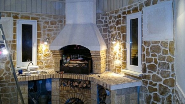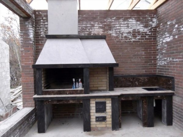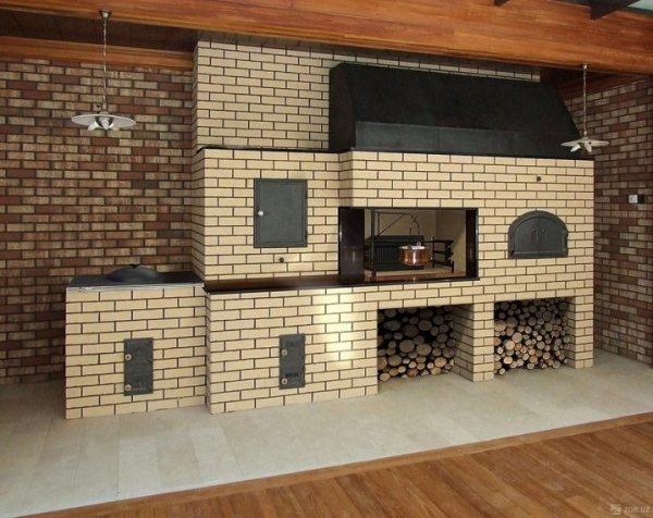 BBQ Kamin. Diese Kamine sind normalerweise offen. Und häufiger sind sie für die Installation im Freien konzipiert (sie werden als Außenkamine, Grills bezeichnet). Wenn Sie Kebabs in einem normalen Kamin kochen, denken Sie an die bevorstehende gründliche Reinigung des Ofenhohlraums und der Auskleidungselemente von den Folgen Ihres Kochens und stellen Sie sicher: Wenn der Feuerraum aus Glas besteht, kann er auch Spritzer aufweisen.