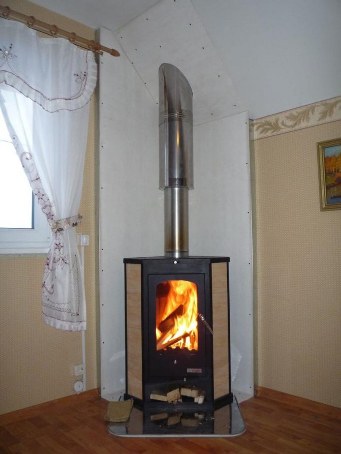 Der Schornstein kann aus Ecken (rechteckig, dreieckig) bestehen und aus Ziegeln bestehen. Experten empfehlen jedoch, einen Metallschornstein mit einer glatten Oberfläche einzubauen, um die Bildung von Ruß zu vermeiden.