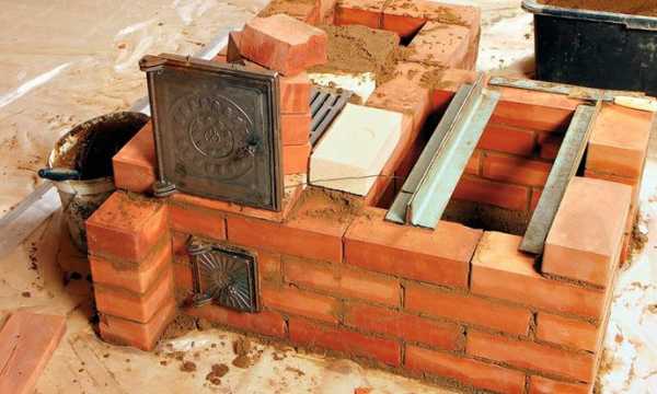 Die Bauarbeiten beginnen mit der Herstellung des Fundaments. Hierzu wird ein Loch gegraben, das 0,5 bis 0,6 m tief und 15 bis 20 cm größer als die Basis des Herdes ist. Eine 5-10 cm lange Sandschicht wird auf den Boden gegossen und vorsichtig gerammt. Bewehrungsstäbe mit einem Durchmesser von 12-14 mm werden nach Möglichkeit darauf gelegt, ein geschweißtes Netz hergestellt oder der Rahmen mit Draht gebunden. Es wird um 5-10 cm über den Sandpegel angehoben und auf Stützen (Steinen) montiert. Danach wird die Grube mit Beton aus Zement, Sand und Kies im Volumenverhältnis 1: 3: 5 gefüllt. Das Fundament sollte 10-15 cm über dem Boden liegen. Die Stelle ist eben und mit Plastikfolie bedeckt, um die Verdunstung von Feuchtigkeit zu verringern. Beton gewinnt in 4 Wochen seine volle Festigkeit. Die Verlegung kann begonnen werden, nachdem die seitlich hervorstehenden Teile des Fundaments einen Grauton erhalten haben.