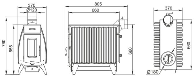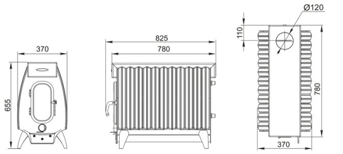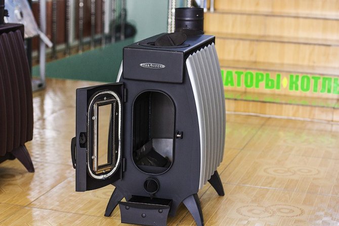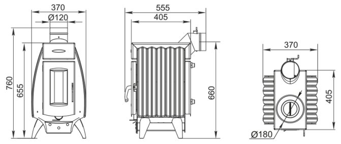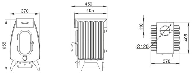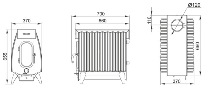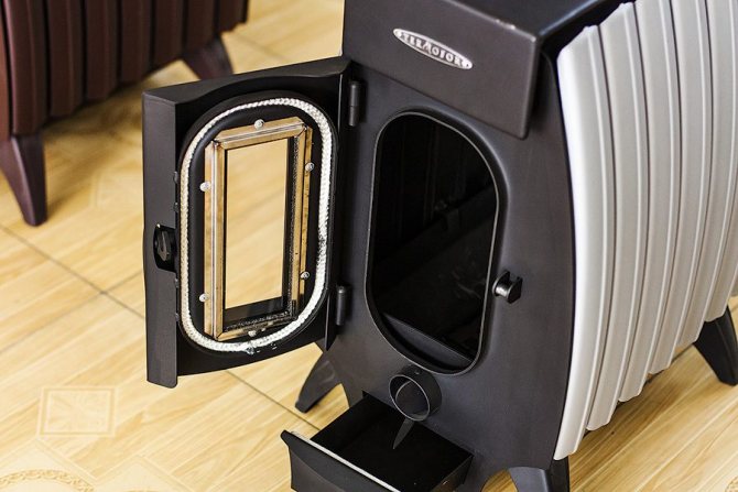 - Tür... Der Drehmechanismus des Griffs fixiert die Tür zuverlässig in der geschlossenen Position, und die Dichtung gewährleistet ein zuverlässiges Drücken der Tür auf den Ofenkörper. Die Tür hat eine Größe von 15 bis 30 cm und öffnet sich in einem Winkel von 120 °, wodurch es bequem ist, den Ofen ganz oben mit Holz zu beladen.