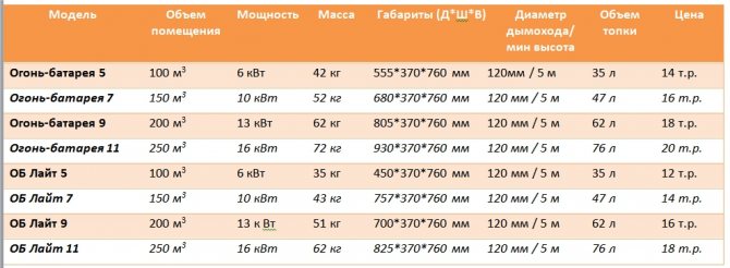 Je nach Modifikation unterscheiden sich die Heizungen in Leistung, Abmessungen, Gewicht und Anzahl der Konvektorpaare. Ein allgemeines Merkmal für die gesamte Fire-Battery-Serie ist eine 15x30 cm große Feuerbox und ein Kaminquerschnitt von 120 mm. Die Hauptparameter der Geräte können in der Tabelle untersucht werden.