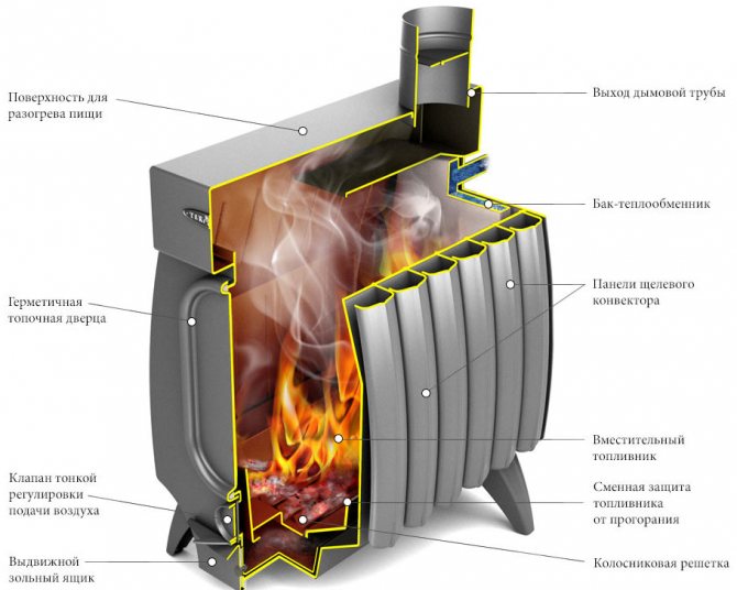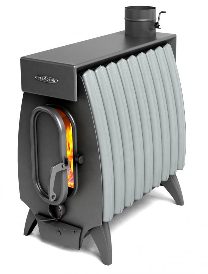 Der hohe Wirkungsgrad des Ofens wird durch die Verwendung des Gaserzeugungsmodus sichergestellt. Merkmal - hohe Wärmeübertragung und schnelles Aufwärmen des beheizten Raums.