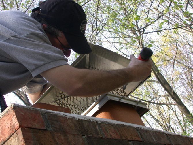 Denken Sie daran, alle Klappen zu öffnen und alle Türen zu schließen, bevor Sie mit der Arbeit beginnen. Nachdem Sie das Dach befestigt haben, entfernen Sie die Kappe vom Rohr und entfernen Sie den Ruß in einem Abstand, den Ihre Hand erreichen kann. Legen Sie dann eine Halskrause in den Schornstein und bewegen Sie sie beim Scrollen allmählich tiefer und tiefer. Wenn Sie auf ein Hindernis stoßen, das Sie nicht durchbrechen können, verwenden Sie den Kern.