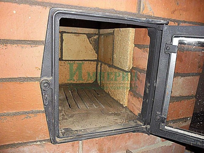 Der Reparaturbereich um die Tür sollte ziegelfrei sein und mit Wasser und einer steifen Bürste gespült werden, um alle Ton- und Rußrückstände zu entfernen. Danach wird die Oberfläche wie bei der Reparatur der Seitenflächen des Ofens grundiert. In allen Rissen rund um die Tür wird eine hitzebeständige Dichtung angebracht und sorgfältig mit Mörtel versiegelt.