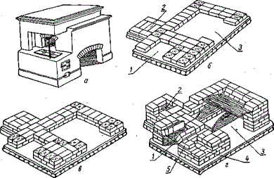 Das Mauerwerk des Ofens des verbesserten (mit einem Ofen in einer Stange) russischen Ofens: a - Gesamtansicht des Ofens; b - 1. Reihe, c - 2. Reihe; d - 7. Reihe; 1, 3 - Backen; 2. - 1. Reihe des Hauptschornsteins; 4 - Plattenasche Pfanne; 5 - stoppt.