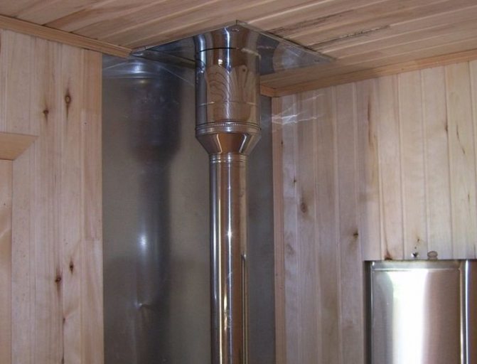 Wenn Sie das System mit Ihren eigenen Händen installieren, müssen Sie besonders darauf achten, durch Decken, Wände und Dächer zu gelangen. Wenn die Kanäle nicht isoliert sind und aus rostfreiem Stahl bestehen, müssen sich die Kaminrohre in einem Abstand von mindestens 1 m von der Decke befinden.