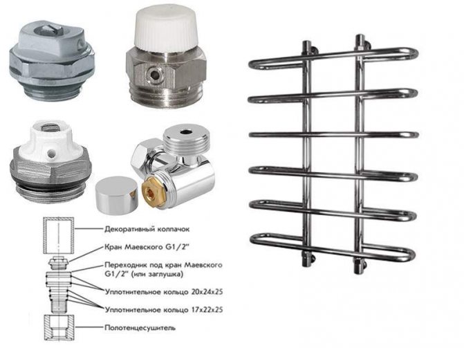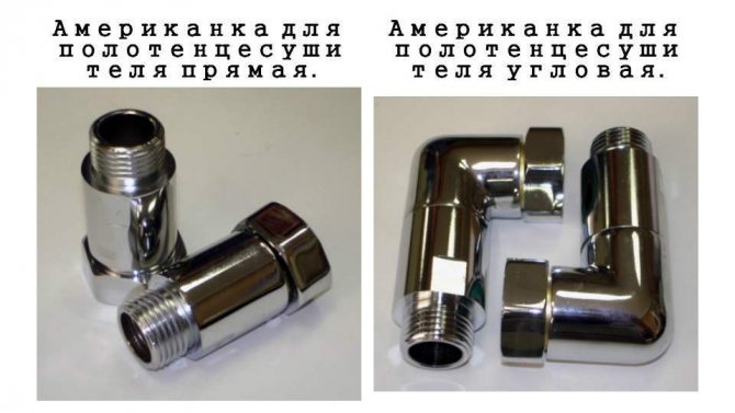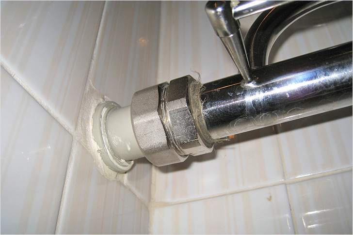 Im Voraus ist es möglich, die Verbindungen von Wasserhähnen mit einem beheizten Handtuchhalter und verchromten Verlängerungskabeln mit MRN (Außengewindekupplung für den Übergang von Metall zu Kunststoff) abzudichten.