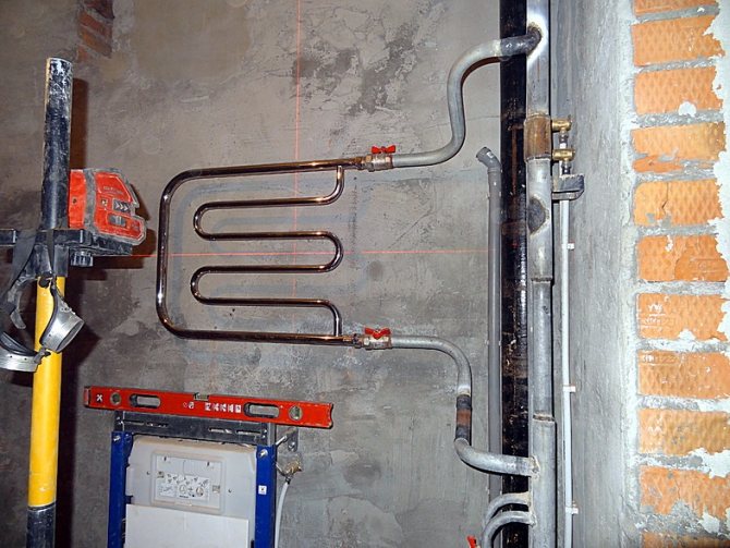 Wenn Sie die Möglichkeit haben, Gasacetylen zu schweißen, erfolgt die Zufuhr und Entfernung von heißem Wasser zum beheizten Handtuchhalter am besten mit Metallwasserrohren. Ist dies nicht möglich, können Polypropylen-Wasserleitungen mit geeigneten Absperrventilen verwendet werden, um die Spule mit einem gemeinsamen Steigrohr zu verbinden.
