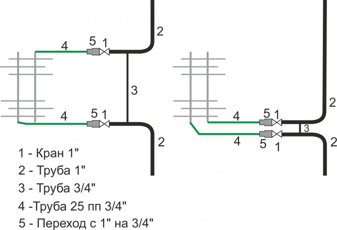 Oft gibt es Situationen, in denen die beheizte Handtuchhalterspule beim Bruch des Heißwasser-Steigrohrs in Reihe geschaltet ist. In diesem Fall müssen Sie zwischen den Einlass- und Auslassdüsen vor den Absperrhähnen einen Jumper (Bypass) aus derselben Wasserleitung mit einem weiteren Absperrhahn in der Mitte installieren. Bei Ausfall oder Demontage des beheizten Handtuchhalters ist der freie Durchgang von heißem Wasser unter Umgehung der Spule erforderlich.