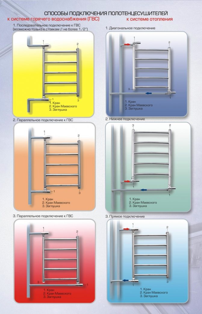 Nachdem Sie sich für den Kauf einer geeigneten Option entschieden und ein Wasser- oder kombiniertes Modell ausgewählt haben, müssen Sie wissen, wie ein beheizter Handtuchhalter ordnungsgemäß im Badezimmer installiert wird, da eine der beiden unten aufgeführten Methoden verwendet werden kann, um ihn mit dem Haus zu verbinden Kommunikation.