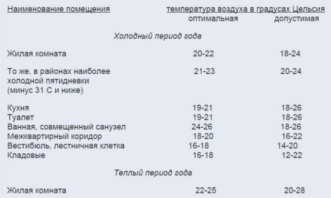 Wichtig! Gemäß SanPiN 2.1.2.2645-10 "Anforderungen an die Lebensbedingungen in Wohngebäuden und Räumlichkeiten" entspricht die normale Lufttemperatur in Wohnräumen einem Indikator von nicht weniger als 18 ° C in Badezimmern von nicht weniger als 25. Die obere Temperaturgrenze in Eine durch dieses Regulierungsgesetz eingerichtete Wohnung hat eine Temperatur von 24 ° C. Die Lufttemperatur auf der Treppe sollte im Bereich von 14 bis 20 ° C und in den Korridoren zwischen den Wohnungen bei 16 bis 22 ° C liegen.