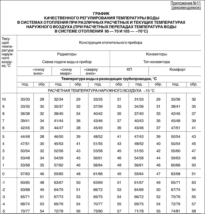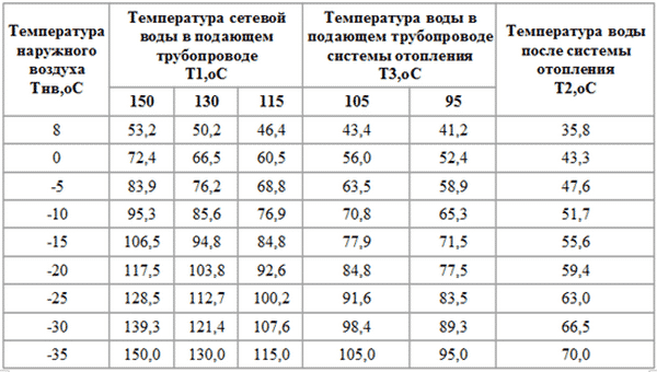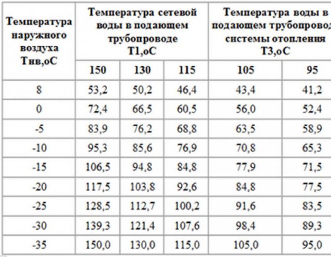 Diese Zahlen zeigen die maximale Temperatur des Zu- und Abwassers während der stärksten Fröste in einem bestimmten Gebiet. Zu Beginn und am Ende der Heizperiode, wenn das Wetter noch nicht zu kalt ist, ist es jedoch nicht sinnvoll, das Kühlmittel auf 105 ° C zu erwärmen. Daher wird ein realer Temperaturheizplan erstellt, in den geschrieben wird Inwieweit sollte das Wasser auf unterschiedliche Außentemperaturen erwärmt werden?Die Abhängigkeit der Erwärmung von den Wetterbedingungen ist in der Tabelle dargestellt, in der Auszüge aus der Grafik für Ufa dargestellt sind: