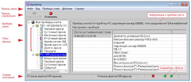 Dieses Gerät verfügt über recht große Funktionen, z. B. über Ethernet, USB, RS-232, aber vor allem über einen SD-Kartenleser. Sie müssen lediglich eine SD-Karte einlegen, die automatisch den gesamten Messverlauf aufzeichnet - Druck, Temperatur, Kühlmittelvolumen und andere Eigenschaften, die zur Berechnung der Heizkosten erforderlich sind. In meinem Fall stellte sich übrigens auch heraus, dass bei Verwendung nativer Durchflussmesser (eines Sensors, der die Masse des Kühlmittels berechnet) Leckagen im Haus automatisch aufgezeichnet und SMS an den Klempner gesendet werden könnten - Sie habe eine Flut, renn ins Haus! Also haben wir die Daten vom Wärmezähler heruntergeladen und können jetzt mit dem Archiver-Programm die Daten vom Zähler verarbeiten: