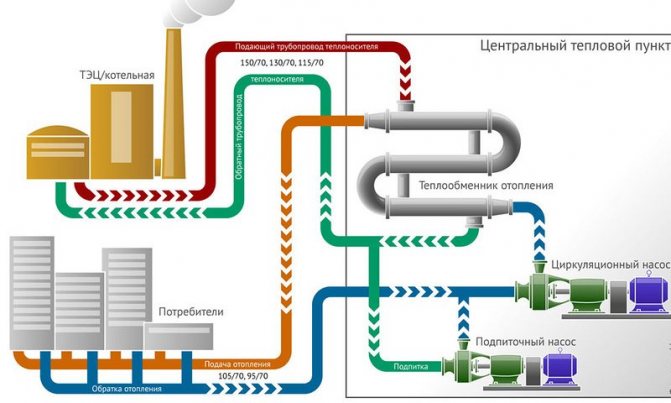 Bei zentraler Wärmeversorgung ist die Wärmequelle ein Kesselhaus oder ein KWK, in dem Heißwasser-Hochtemperaturkessel installiert sind (bei KWK - Dampf). Erdgas wird üblicherweise als Brennstoff verwendet, andere Energieträger werden in geringerem Umfang eingesetzt. Die Temperatur des Kühlmittels am Auslass des Kessels beträgt 115 ° C, aber das Wasser kocht nicht unter Druck. Die Notwendigkeit einer Erwärmung auf 115 ° C erklärt sich aus der Tatsache, dass Kesselanlagen in diesem Modus mit maximaler Effizienz arbeiten.